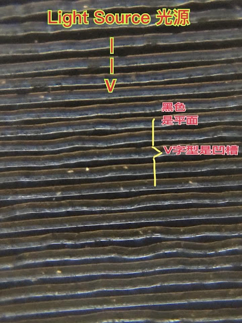 圖八、九:LED手電筒照明用某個角度斜照,剛好讓溝槽上部交界透亮,造成很炫,很有未來感的效果,看了感覺很像在大峽谷看日出。